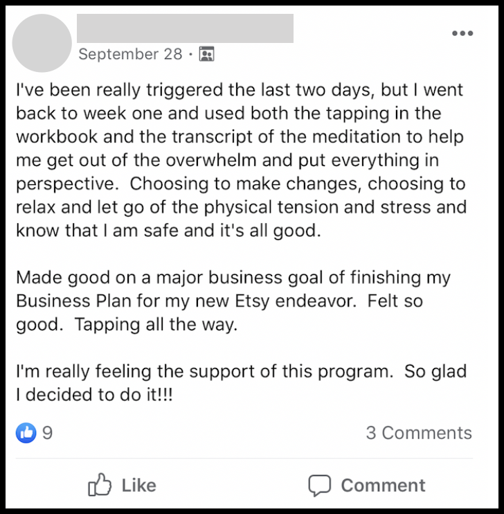 "I really didn't want to do this week's module because I've had so much going on and felt so overwhelmed, but I remembered how good I felt after I did last week's module so I went and did it anyway.  I am so glad I did because "wow!" - what a difference it made for me.  I'm so excited to keep pushing forward with this program."