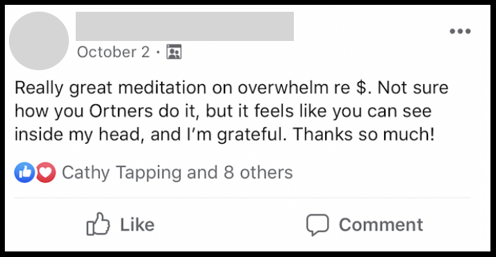 "I so enjoyed the meditation this morning.  One of the things I love about all the Ortners is the simplicity of the language which says exactly what is going on without being overly complex (I tend to over-intellectualize).  For me that simple, heartfelt language creates these moments of peace where i can relax and feel safe."