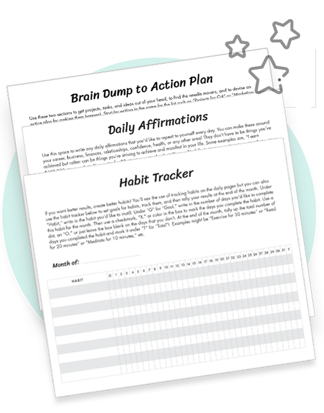 Brain Dump to Action Plan Pages to help you get your ideas out of your head and onto paper.  With these pages and the simple process outlined on them you'll get clear on which things you want to do, and which things you want to push aside.