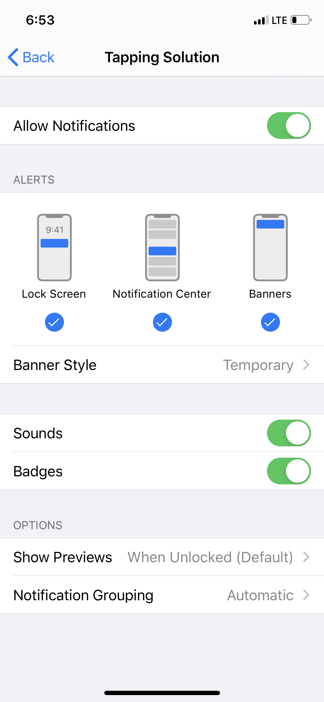 If you have an iphone go to Settings / Notifications / Tapping Solution and toggle on "Allow Notifications"